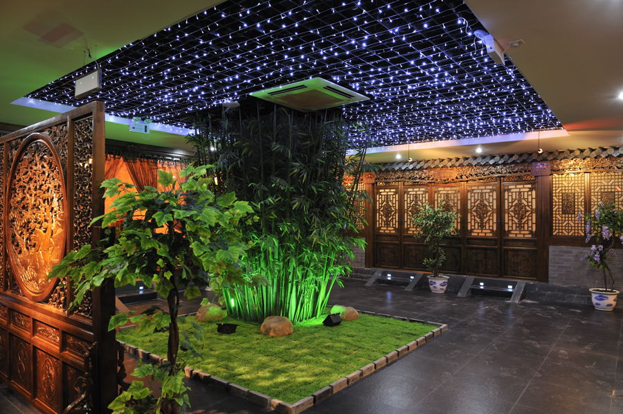 本設計案例位于松江 玉樹北路 465號 是一家集棋牌休閑 餐飲娛樂于一體的休閑會所!主要設計風格中式古典園林設計 中式園林設計元素與現代燈光音響及西式公共設施設計融合 假山水 竹林 牌匾 燈籠 雕塑 壁畫 根雕藝術 鏤空回廊? 青石路面 書法等等元素 完美的統一點綴在這個空間里,真正達到了移步換景,處處皆有亮點的效果。
