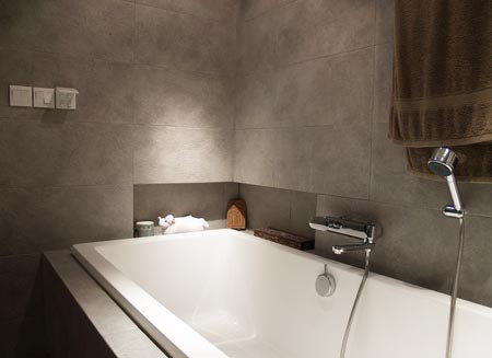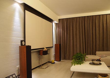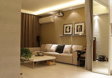 此案例中僅用了淺棕色,或因材質不同,或光照不用形成同種色彩的不同表現!當然為了色彩美學的和諧,必要的重色還是要有的!于是一個黑色的抱枕!一塊深色的版畫就輕易地解決了問題!